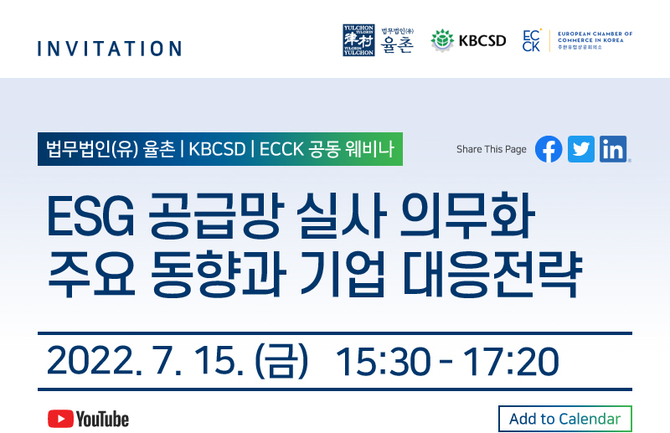 (조세금융신문=고승주 기자) 율촌과 지속가능발전기업협의회(KBCSD)가 오는 15일 오후 3시 30분 ESG 공급망 실사 의무화 주요 동향과 기업 대응전략 웨비나를 개최한다.