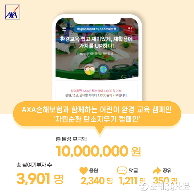 (조세금융신문=송기현 기자) 악사(AXA)손해보험이 '자원순환 탄소지우기' 모금 캠페인을 벌였다.