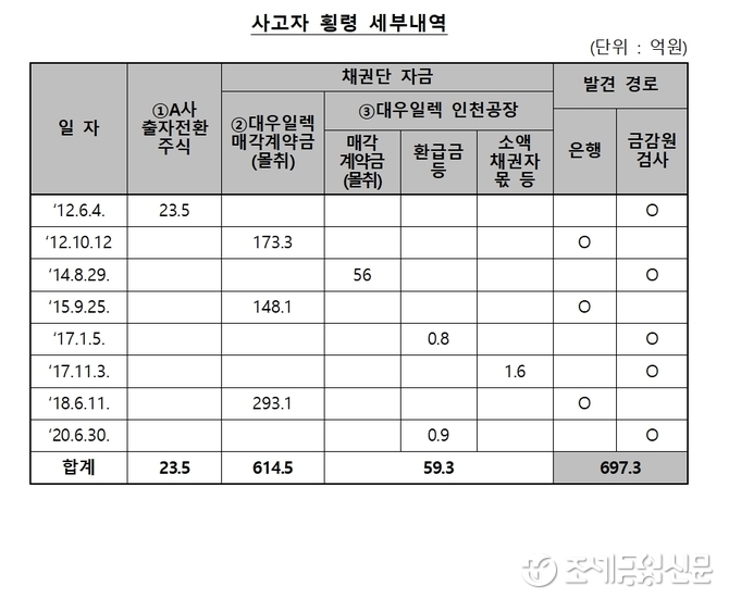 A씨는 다음으로 대우일렉트로닉스 매각 몰취계약금을 횡령했다. 대우일렉트로닉스 지분 매각 진행과정에서 몰취한 계약금을 관리하던 중 직인을 도용해 출금하거나 관련 공‧사문서를 위조해 출금결재를 받는 방식으로 3차례에 걸쳐 약 614억5000만원을 횡령했다. 이때 횡령금 614억5000만원은 몰취한 계약금 678억원, 기간 발생이자가 36억5000억원이 합쳐진 금액이다.