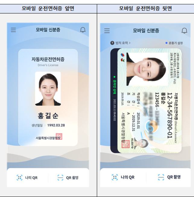 또 모바일 운전면허증은 안전성 확보를 위해 블록체인·암호화 등 다양한 보안기술이 적용됐으며 본인 명의 1개 단말기에만 발급된다. 분실 신고 시에는 잠김 처리돼 화면상 표시되지 않는다.