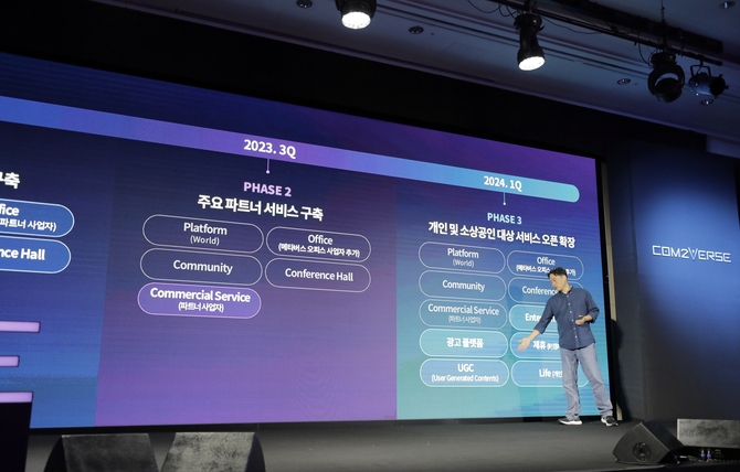 이경일 컴투버스 대표는 여타 메타버스와 차이점으로 시민권을 부여하겠다고 설명했다. 이 대표는 “오는 2023년 1분기에 메타버스 오피스와 컨벤션센터 구축을 진행하고 2023년 3분기까지 컴투버스 내 주요 파트너의 서비스를 구축한다”고 부연했다. 이어 “2024년 1분기에는 개인과 소상공인 대상으로 컴투버스 서비스를 선보이고 확장해 나간다”고 강조했다.