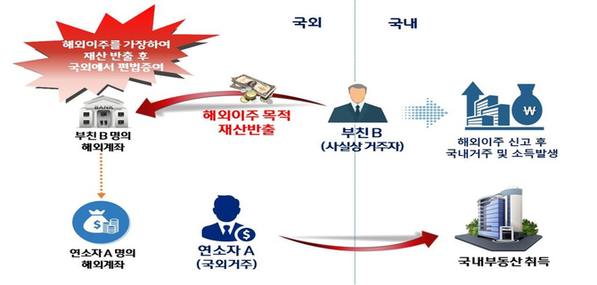 자금출처를 추적하던 국세청은 부친B가 해외이주 신고를 하고 해외이주 목적으로 외환을 반출했으나, 실제로는 국내에서 사업가로 활동하고 돈만 외국으로 보냈다는 것을 확인했다.