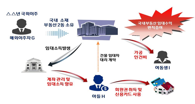 분석 결과, 아들 H가 임대부동산의 임대차 계약 등을 관리하면서, 임대소득을 본인 신용카드 결제대금 등으로 유용하고, 최근 몇 년간 입국사실이 없는 해외이주자 명의로 콘도회원권, 고급외제차 등을 사들 사실이 포착됐다.