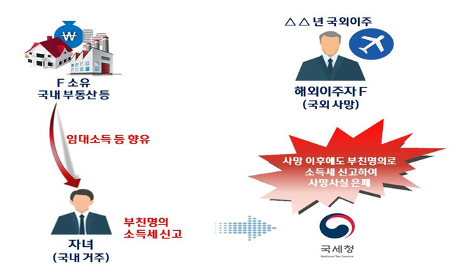 F씨는 부가가치세, 소득세 등 세금을 잘 신고하고는 있으나, 최근 수년간 국내 출·입국 사실이 없어 상황을 살펴본 결과 수년 전 해외현지에서 F씨가 사망한 사실을 확인했다.