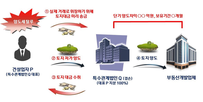 특수관계법인 Q는 애초에 양도세 탈루를 하기 위해 만든 결손법인으로 건설업자 P로부터 거래대금 수십억 원을 미리 수취 후 재지급하는 방식으로 금융거래를 조작했다.
