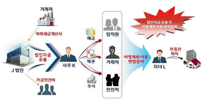 K는 허위세금계산서 수취, 가공인건비 계상 등을 통해 수십억대 법인소득을 빼돌려 임직원·친인척 등 명의의 차명계좌로 숨겼다.