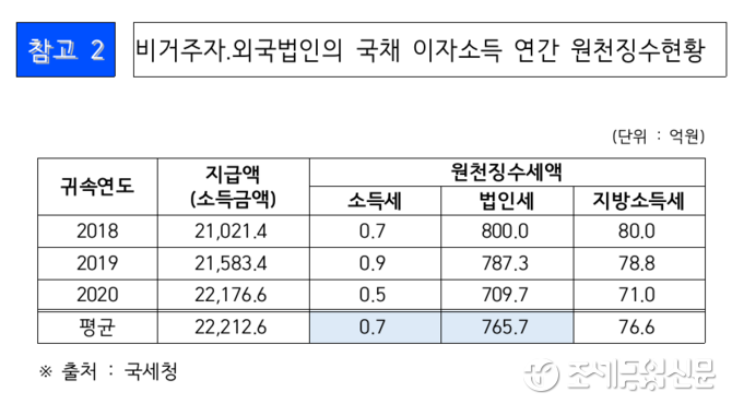 국세청이 국회 기획재정위원회에 보고한 자료에 따르면, 지난 2020년 비거주자와 외국법인에게 지급된 이자 소득금액은 2조2212억600만원이다. 이에 따라 그 해 원천징수 의무가 있는 금융기관이 원천징수 납부한 세금은 소득세 7000만원, 법인세는 765억7000만원이다. 지방소득세 76억6000만원까지 포함하면 842억3000만원이다.