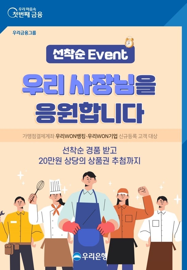 (조세금융신문=진민경 기자) 우리은행(은행장 이원덕)은 비대면 채널로 가맹점 결제계좌를 첫 가입하거나 우리은행으로 변경하는 고객들을 대상으로‘우리 사장님 응원합니다’이벤트를 12월 16일까지 실시한다고 30일 밝혔다.