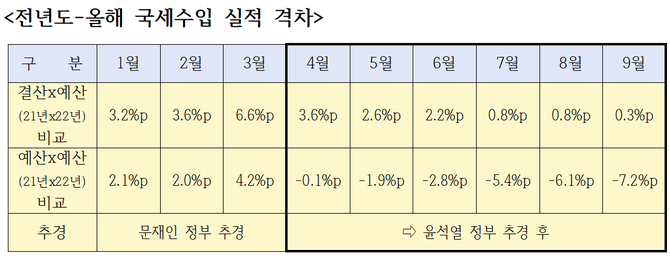 윤석열 정부 이전에는 올해 국세수입 실적과 작년도 국세수입실적을 비교할 때 작년도 예산치와 결산치 두 개를 비교했다.