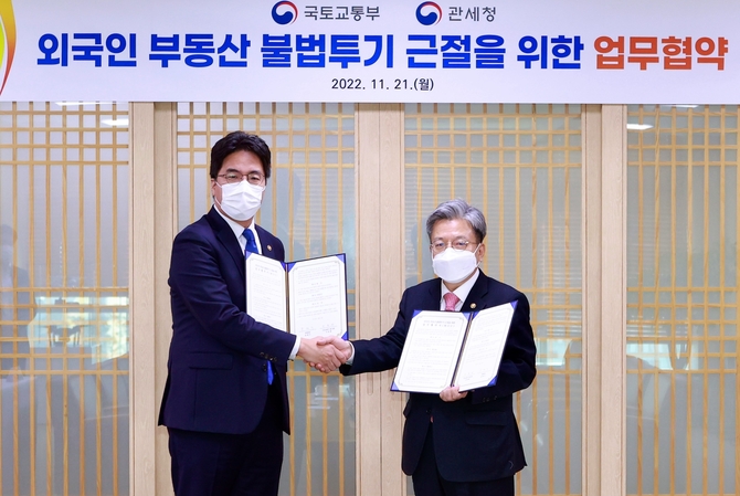 이에 관세청(청장 윤태식)과 국토부(장관 원희룡)는 지속해서 증가하고 있는 외국인 부동산 매수와 관련, 불법 해외자금을 이용한 무분별한 부동산 투기를 막기 위해 21일 업무협약(MOU)를 체결했다. 외국인의 부동산 취득자금 불법반입에 대한 상시 단속을 강화할 필요가 있다는 데 양 기관이 공감한 것이다.