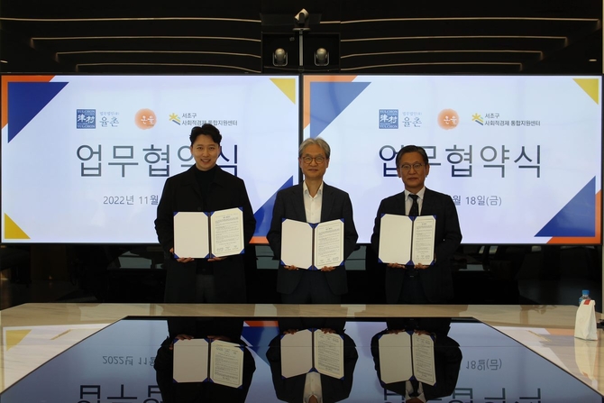 이날 율촌, 온율, 서초구 사회적경제통합지원센터는 사회적경제‧소셜벤처‧임팩트 창업 종사자를 대상으로 한 컨설팅 사업과 기타 상호 관심분야(문화예술 등) 및 필요하다고 인정되는 사업의 상호협력을 약속했다.
