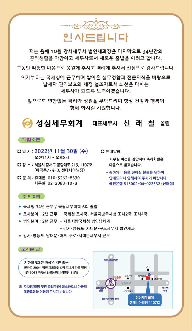(조세금융신문=구재회 기자) 신래철 강서세무서 법인세과장이 34년간의 공직생활을 마감하고 오는 30일 서울 강서구 마곡역 인근 센테니아빌딩 11층에서 성심세무회계 대표세무사로 개업소연을 갖는다.