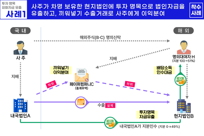 A사 사주는 자신과 관계없는 회사인양 가장해 해외에 차명으로 현지법인 B를 세웠다. 그리고 자신이 경영하는 국내법인 A를 동원해 회사 B의 지분 49%를 해외투자 명목으로 사들이게 했다.
