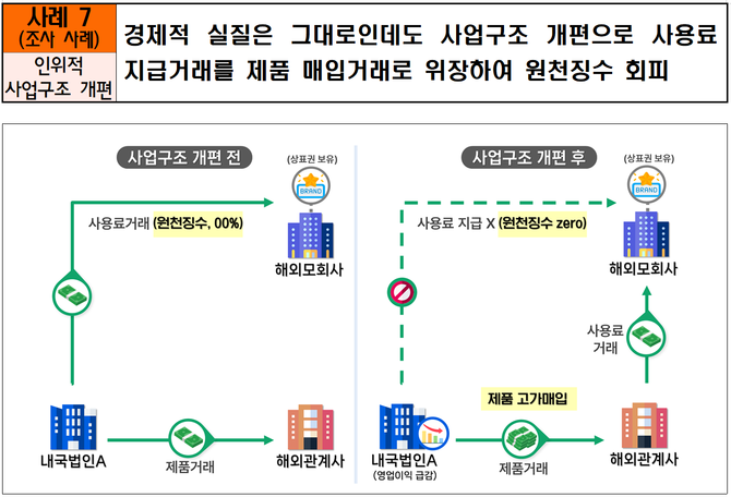 내국법인 A는 사용료를 지급하지 않지만 해외관계사에 엄청난 수입대금을 지불하면서 소득이 국외 이전되고 영업이익은 급감했다. A의 사용료 원천징수 세액이 0이 되면서 법인세도 급격히 감소했다.