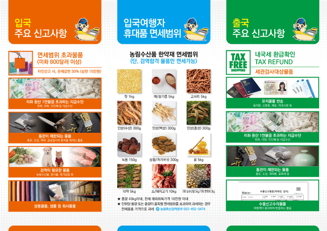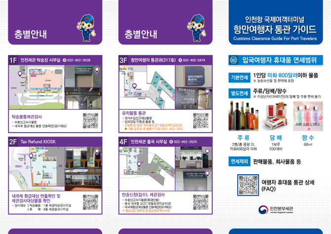 통관가이드 주요 내용으로는 ▲ 여행자 휴대품 기본 면세범위(미화 800달러) · 별도면세(주류 2병/총 2L/향수60ml) ▲ 입 · 출국시 주요 세관 신고 사항 안내 ▲ 인천항 주요반입 품목인 농림수산품 및 한약재 면세범위 안내 ▲ 신국제여객터미널 층별 세관 업무처리 사무실 위치 및 연락처 안내 등이다.