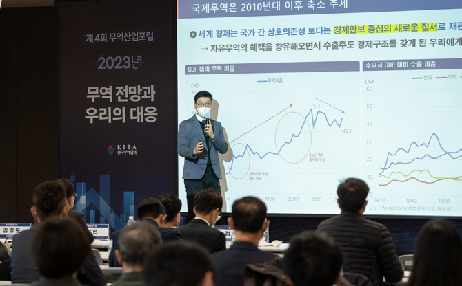 홍지상 한국무역협회 국제무역통상연구원은 8일 ‘2023년 무역 전망과 우리의 대응’을 주제로 열린 ‘제4차 무역산업포럼’에서 2023년 세계경제와 한국무역에 대해 기본, 낙관, 비관 등 여러 시나리오로 나누어 전망했다.