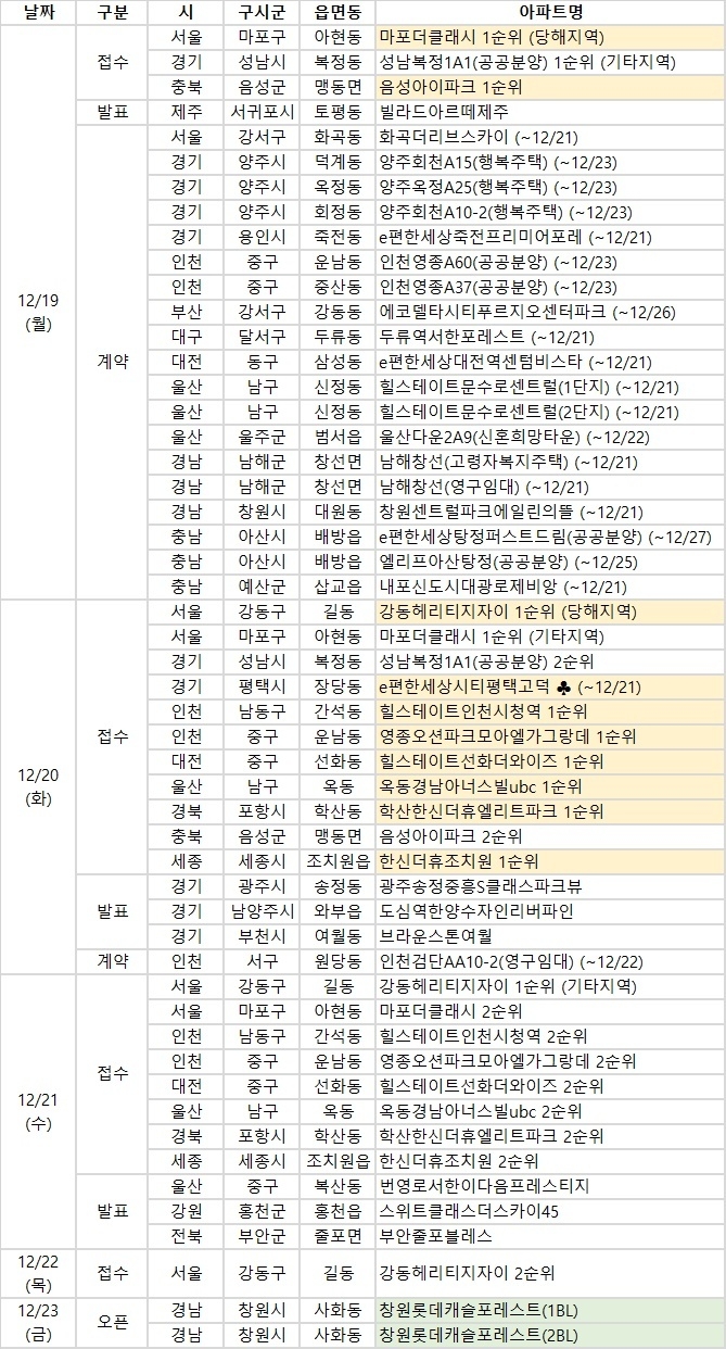 주요 분양물량은 서울 강동구 길동 '강동헤리티지자이', 서울 마포구 아현동 '마포더클래시', 충북 음성군 맹동면 '음성아이파크' 등이다.