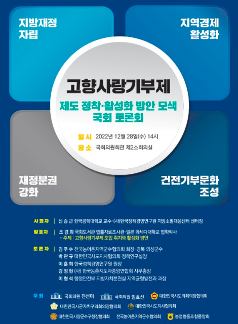 이 날 토론회는 더불어민주당 사회적경제위원장이자 국회 기획재정위원회 소속인 진선미 의원과 국회 행정안전위원회 임호선 의원이 주최한다. 전국의 지자체 및 지방의회 협의체인 대한민국시도의회의장협의회, 대한민국시군자치구의회협의회, 대한민국시도지사협의회, 대한민국시장군수구청장협의회, 전국농어촌지역군수협의회 그리고 최근 고향사랑팀 조직을 신설한 농업협동조합중앙회가 공동주최로 참여하여 의미를 더했다.