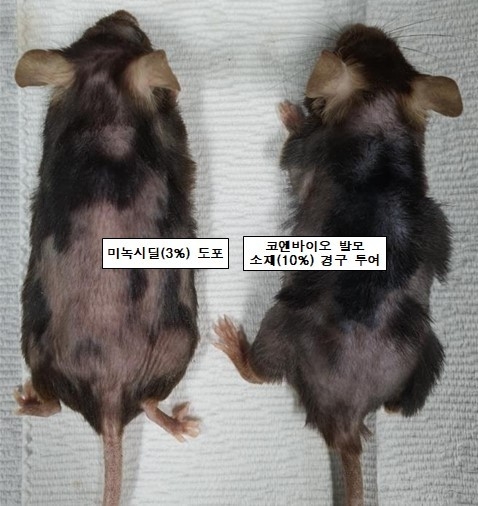 또한 사람으로 치면 70대 후반의 나이와 맞먹는 1년 8개월 이상 생존한 나이 든 암컷 마우스에게 개발된 발모 소재를 경구 투여한 결과, 3% 미녹시딜과 비교 시 매우 우수한 발모 효과를 보였다(사진 참조). 이와 같은 결과는 노화로 인한 노인성 탈모에도 효과가 있는 우수한 소재로 개발이 가능함을 보여준다.