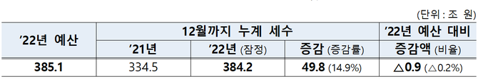 국세청이 2일 공개한 2023년 국세행정 운영방안에 따르면 지난해 1~12월까지 국세청 누적 세수는 384.2조원으로 ‘윤석열 정부 추경’에서 잡았던 연간 목표(385.1조원)에서 9000억원을 미달했다.