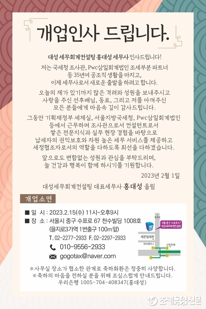 (조세금융신문=이상현 기자) “국세청과 기획재정부(옛 재정경제부)에서 전반전 17.5년, 삼일회계법인 조세본부에서 후반전 17.5년, 도합 35년의 2 피리어드를 뛰고 이제 독립 조세 컨설턴트로 3피리어드에 투입됩니다.”