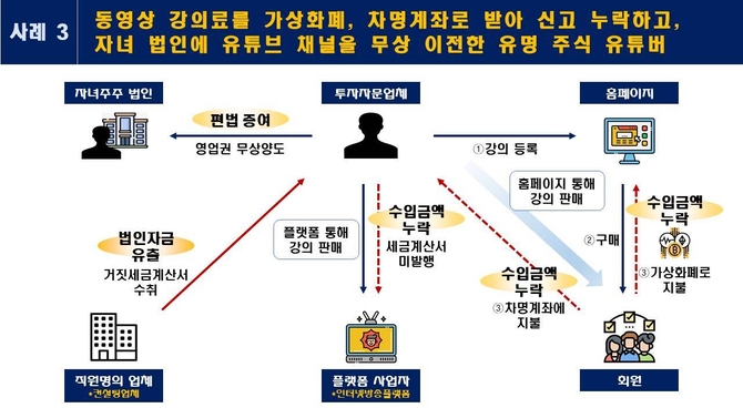 유명 주식 유튜버 A가 운영하는 온라인 투자정보서비스업체는 주식시장 상승기에 매출이 4배 이상 급증하자홈페이지를 통한 동영상 강의 판매수입 수십억 원을 차명계좌 또는 가상화폐로 받아 신고 누락했다.