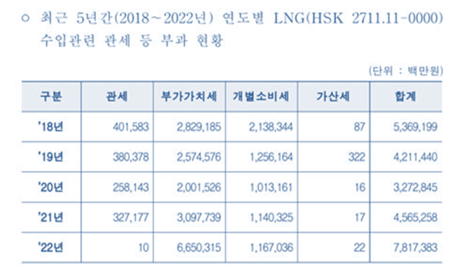 20일 국회 기획재정위원회 소속 한병도 의원(더불어민주당)이 관세청에서 제출받은 자료에 따르면 지난해 LNG 수입분에 부과된 세금은 7조8천174억원으로 전년(4조5천653억원)보다 3조2천571억원(71.2%) 증가했다. 세목별는 부가가치세가 6조6천503억원으로 대부분을 차지했다.