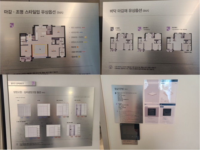 이와 같은 면적 기준으로 마감 Style up옵션은 ▲벽 229만원 ▲조명 769만원 ▲히든도어 447만원 ▲바닥 814만원과 1090만원, 주방 Style up옵션은 ▲주방 상판 319만원 ▲주방 조명 252만원 ▲주방 가구 1022만원 ▲장식장 119만원 ▲욕실 Style up옵션 1387만원이다.