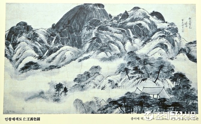인왕제색도가 눈에 띄었다. 인왕제색이란 ‘인왕산의 비 갠 모습’이란 뜻이다. 의미 그대로 작품에선 비 갠 뒤 안개가 피어오른 인왕산의 경치가 자유분방한 필치로 펼쳐져 있었다. 전경에는 자욱한 안개가 품은 듯 감싼 숲과 집이 있고 먼 배경으로 치마바위, 범바위 등이 무게감을 드러냈다.