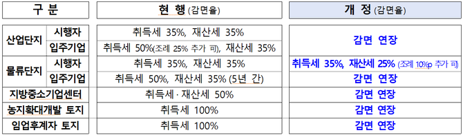 산업·물류단지, 중소기업, 농업·어업·임업 등에 대한 감면 지원을 연장한다.