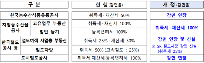 농·수산물 가격, 물류비, 지하철에 대한 지방세 감면 지원은 유지된다. SRT 운영사인 SR에 대해선 고속철도차량 취득세 25% 감면이 신설됐다.