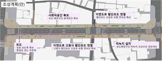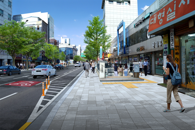 우선 지하철 환기구 등 대형 시설물로 좁아 통행이 불편했던 보도공간을 기존 0.7~1.5m에서 2~2.8m까지 최대 1.8배 수준으로 대폭 넓힌다. 또 노후 보도 포장을 교체하고 포장재도 통일해 도시 미관 효과를 높인다.