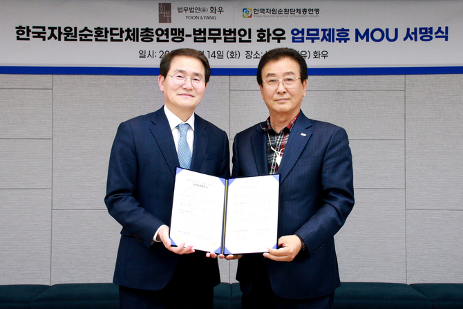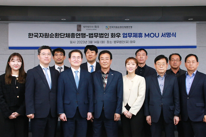 이를 위해 법무법인 화우(대표변호사 정진수)는 지난 14일 서울 아셈타워 화우 회의실에서 61개 자원순환단체를 대표하는 한국자원순환단체총연맹(회장 신창언)과 ‘자원순환 등 환경업무의 효율적 수행을 위한 업무협약’을 체결했다.