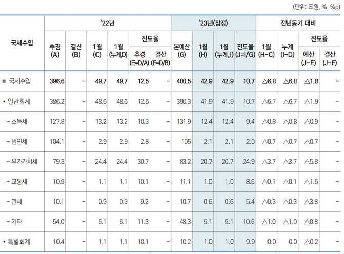 통상 1월에 연간 세수목표의 11~12%를 달성하던 국세수입이 올해는 10.7%로 뚝 떨어졌다.