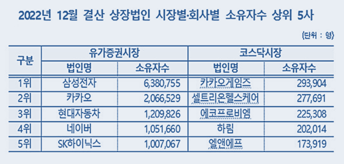 코스닥시장에서는 코스닥에서는 게임, 바이오, 2차전지 등 성장성 높은 테마 종목의 주주가 크게 늘었는데, 카카오게임즈(29만3천904명), 셀트리온헬스케어(27만7천691명), 에코프로비엠(22만5천308명), 하림(20만2천014명), 엘앤에프(17만3천919명) 순이었다.