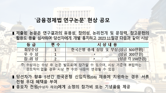 한은에 따르면 논문 주제는 금융경제법 관련 현안과 개선과제 등으로, 응모자는 7월 28일까지 A4용지 20∼40장 분량의 논문을 한은 이메일로 제출하면 된다.