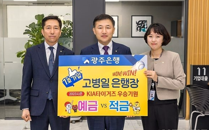 광주은행은 매년 프로야구 시즌마다 KIA타이거즈의 우승을 기원하는 ‘KIA타이거즈 우승기원 예·적금’을 판매해 야구팬들의 뜨거운 관심을 받고 있는데, 고병일 광주은행장은 이날 1호로 가입했다.
