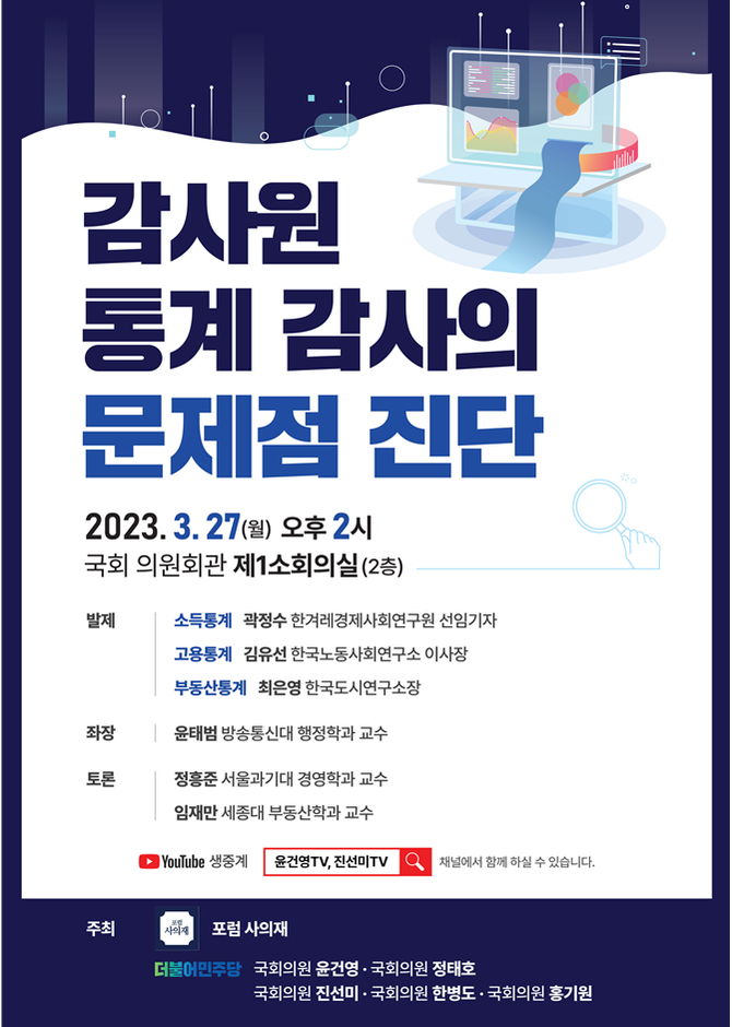 (조세금융신문=고승주 기자) 더불어민주당 기재·국토·환노위 소속 의원 5명(사의재 포럼, 이하 포럼)이 오는 27일 오후 2시 국회의원회관 제1소회의실에서 ‘감사원 통계 감사의 문제점 진단’ 토론회를 개최한다.
