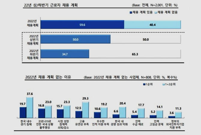 채용 계획이 있다고 답한 기업은 59.6%로, 상반기에는 2곳 중 1곳(50%)이 인력을 채용했지만 하반기에는 10곳 중 3곳(34.7%)만 채용 계획이 있었다. 2021년보다 채용 규모를 늘리겠다고 응답한 외투기업은 58.1%로 절반 이상이었지만, 채용 규모를 유지하거나 더 줄일 예정이라는 기업도 41.9%나 됐다.