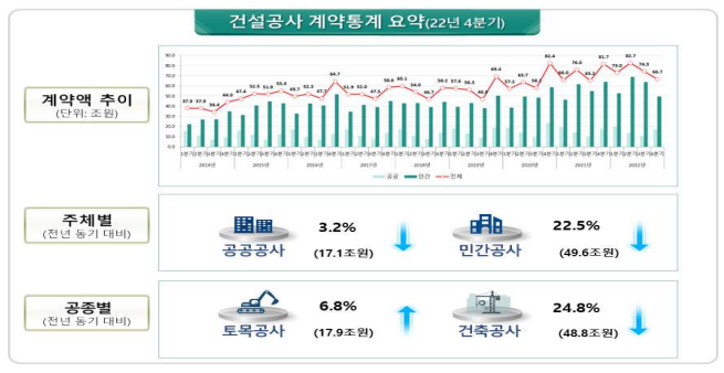 공사 주체별로 보면 국가·지방자치단체·공공기관 등이 발주하는 공공공사 계약액은 전년 동기 대비 3.2% 감소한 17조1000억원, 민간은 22.5% 줄어든 49조6000억원을 기록했다.