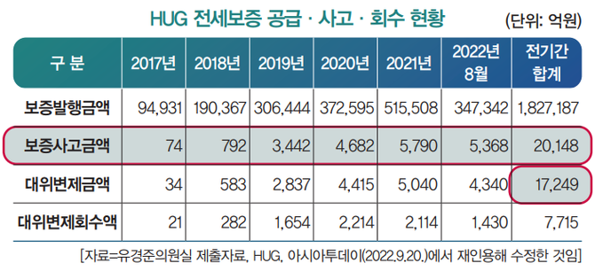 국민의 힘 유경준의원실 제출자료를 인용하면 HUG의 전세보증 사고액수는 2017년 74억원에 불과했으나 매년 크게 늘어나 2021년 5790억원 규모까지 커졌고, 2022년 8월 이미 전년도 수준인 5368억원에 달했다고 한다.