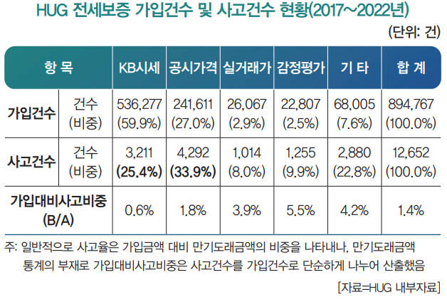 KB시세와 공시가격은 사고비율은 낮지만 사고건수에서는 다수를 차지하고 있는데, KB시세의 경우 매도희망자의 호가를 중심으로 조사한 것에 불과하고, 공시가격은 그 자체는 시세보다 낮지만 150%까지 상향조정이 가능했기 때문에 경우에 따라 적정시세보다 높게 보증했을 가능성도 있다.