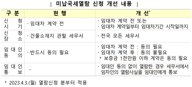 앞으로는 임대차 계약을 맺은 후 임대차 기간이 시작하는 날까지 임대인 동의 없이 열람을 신청할 수 있고, 임차물 관할 세무서가 아니라 전국 세무서 어디서나 신청할 수 있게 된다.