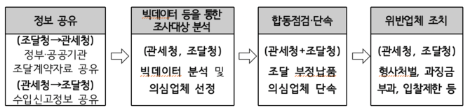 조달청은공공조달 품목 전반에 대한 정보를 상시적 제공으로 확대하고, 관세청 또한 부정납품단속 정보 및 관련 수입 정보 를 상시적 제공으로 확대한다.