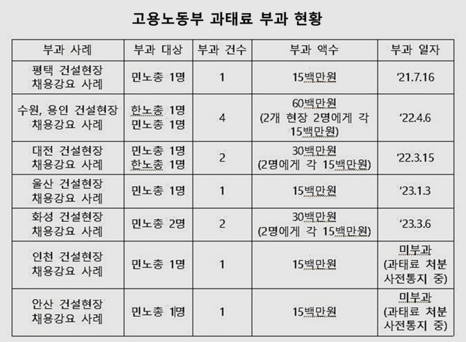 노동부가 노조 관계자에게 부과한 과태료는 건당 1천500만원이다. 12건 중 10건은 이미 부과됐고, 2건은 과태료 처분을 사전 통지한 상태다. 위반한 노조를 상급 단체별로 보면 민주노총 9건, 한국노총 3건이다.