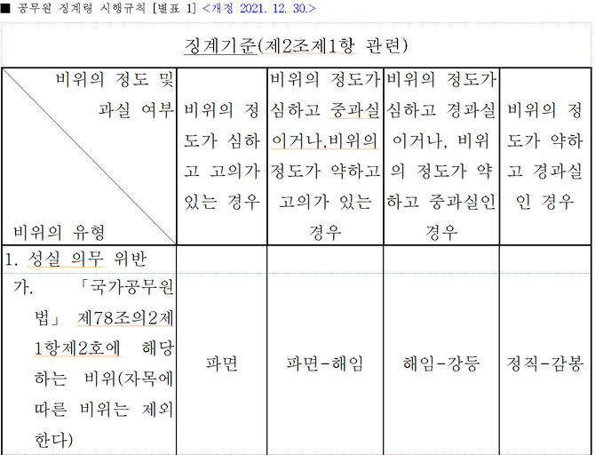 공무원 징계령 시행규칙 별표 1에 따르면, 공무원의 공금횡령 중 파면을 내릴 때에는 비위에 따른 피해가 심각하고, 행위에 고의가 있는 경우로 한정하고 있다.