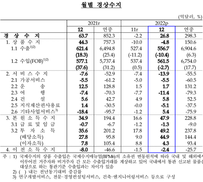 반면, 상품수지는 2021년 757억3000만달러에서 2022년 150억6000만 달러로 5분의 1토막이 났다. 무역수지도 2021년 293억700만달러 ‘흑자’에서 2022년 477억8500만달러 ‘적자’로 주저앉았다.