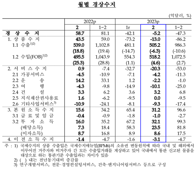 한국은행 월별 경상수지 추이에 따르면, 1~2월 경상수지는 47억3000만 달러 적자가 났다. 1월엔 42억1000만달러, 2월엔 5억2000만달러 적자다.