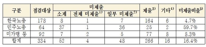 끝까지 내지 않은 52개 노조는 상급 단체별로 민주노총 37개, 한국노총 8개, 기타(미가맹 등) 7개다. 미제출 비율은 민주노총 59.7%, 한국노총 4.7%, 기타 8.3%로 민주노총이 한국노총의 12배 이상에 달했다. 조직 형태별 미제출 비율은 산별노조 35.2%, 연맹·총연맹 25.9%, 기업단위 노조 3.0%다.