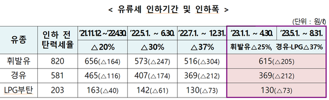 현재 정부는 유종별로 휘발유는 전체 세금의 25%, 경유·LPG부탄은 37%를 깎아주고 있다.